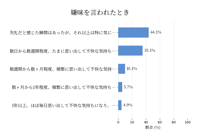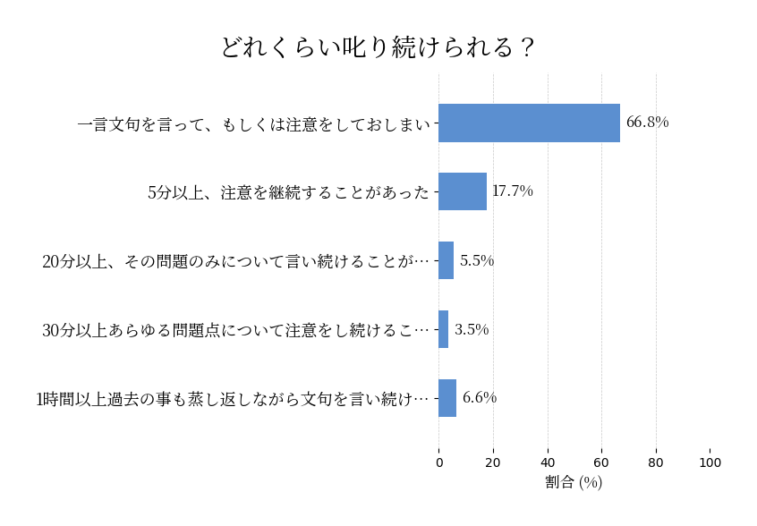 最近ひと月の間に部下や子供など自分より目下の人に対して何かを注意する際にどれくらい長く叱り続けたことがありますか?