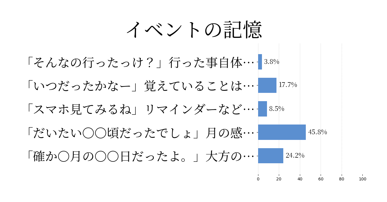 あなたは数人で談笑しています。ふと一人が言います。「あのイベントは楽しかったよね。あっ、でも、そういえばあれっていつだったっけ?」あなたはどんな応答になることが多い?