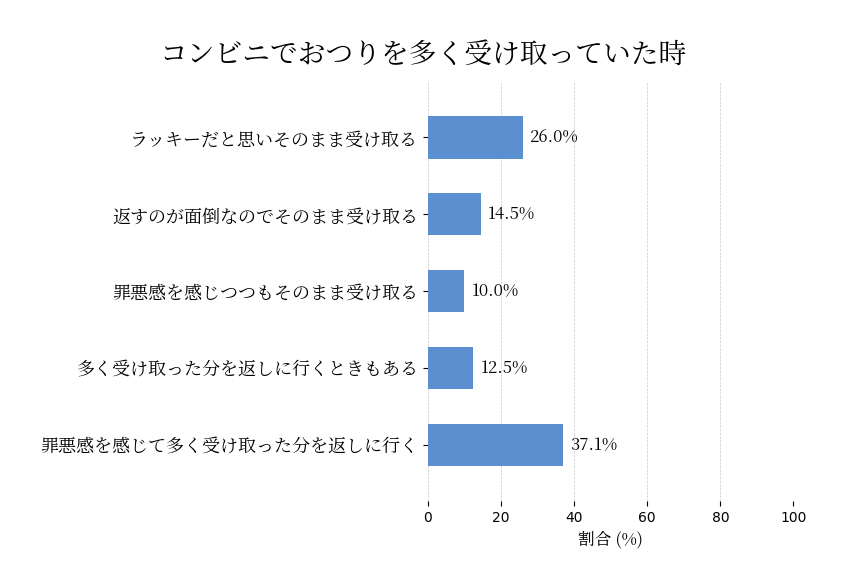 コンビニで会計をして外に出た時にレシートに記載された額よりも多くおつりを受け取っていたことに気付いた時の対応。