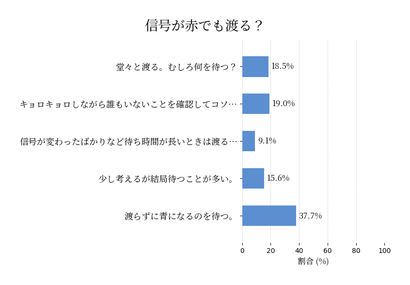 信号は赤ですが周りに見ている人は誰もいません。見通しがよく車がくる気配もありません。そのとき渡りますか?