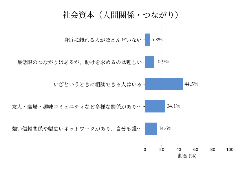 家族・友人・職場・地域・コミュニティなど、人とのつながりや信頼関係から得られる力の状況に近いものを選んでください。