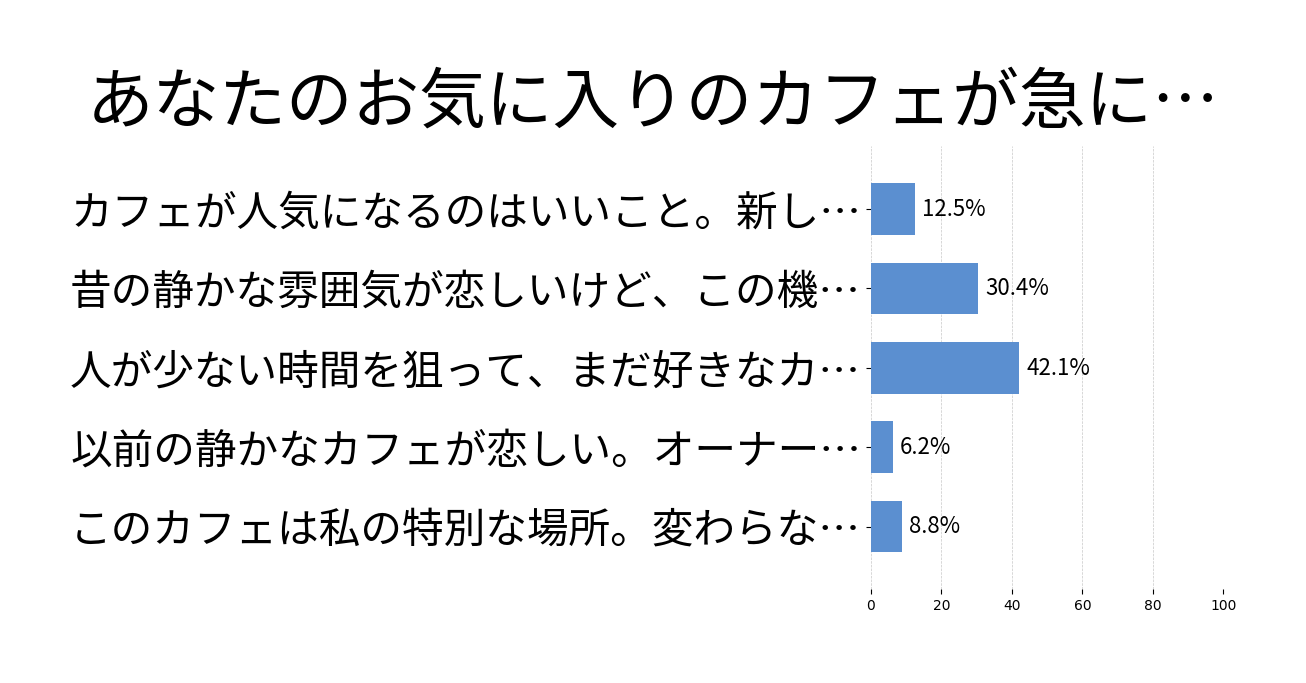 ずっとマイペースで過ごしていたあなたのお気に入りのカフェが、突然SNSで話題になり、人でいっぱいになりました。これまでは穴場的な静かな場所だったのに、今では常に混雑しています。
