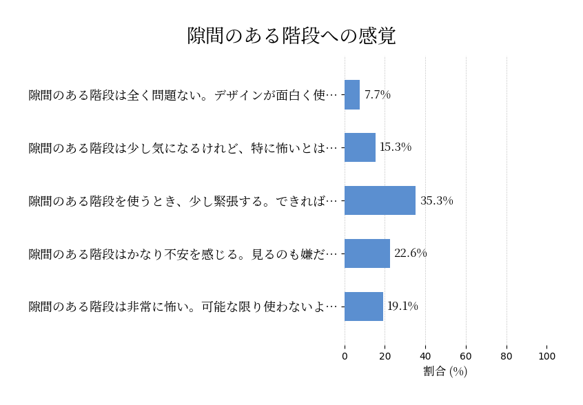 デザイン性の高い建物や施設でよく見る、隙間のある階段についてどう思いますか?これらの階段は、ステップの間に隙間があり、下が見えることがあります。