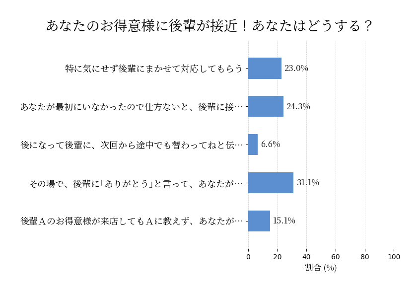 ブティックに勤務していて、接客担当をしている。同僚の店員の中で後輩Aがいる。目立ちたがり屋でプライド高い。いつもはあなたが対応しているお得意様が来店。あなたが少し場を離れた間にAが対応していて、その場に戻ったあなたに気づくも素知らぬふりで接客を続けている。そのときあなたはどうする?。