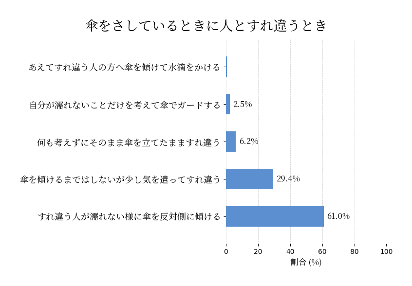 雨が降っている街中で傘をさして歩いているときに前から人が来てすれ違う時の対応