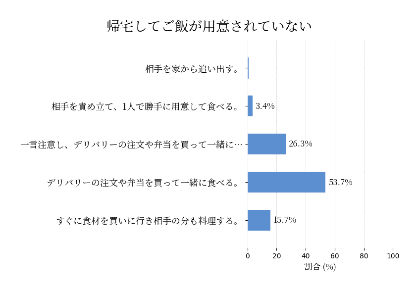 専業主婦(主夫)の配偶者と2人暮らしのあなた。残業から疲れて帰宅したところ、晩ご飯が用意されていない。連絡もなかったため、どうしたのか尋ねたところ「今日はご飯作るのめんどくさくなった。連絡はうっかりして忘れてた。」とのこと。あなたならどうする?