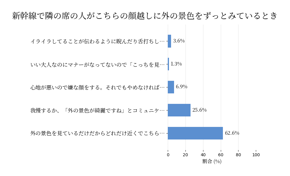 年末に新幹線で帰省しようと二週間前に窓側の席を予約しました。当日は雪が降っており雪化粧された景色が綺麗でした。隣の通路側の席には年配の女性が足元にキャリーバッグを置くように座っており、しばらくすると外の景色を見るためかこちらに顔を向けるようになりました。窓は小さく距離も近いのでこちらの横顔を間近で見るような状態です。度々顔をこちらに向け10分以上向きっぱなしのときもあり気になって読書などに集中できません。