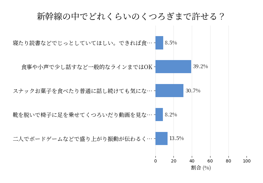 新幹線の三列シートの窓側の席に座っています。隣の席にカップルが座っているときどれくらいのくつろぎ方までOK?