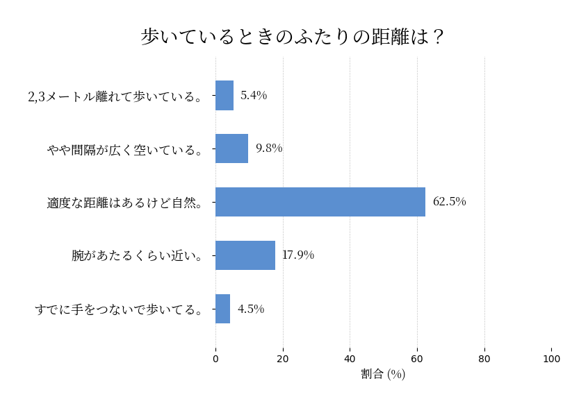 興味のある相手と駅に向かう途中で偶然会って一緒に向かうとき、近づこうとしたらどれくらいまで間隔を縮められる?