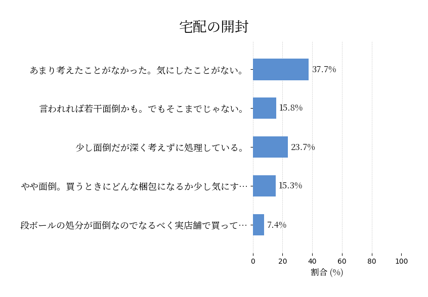 通販などで買い物し宅配が届いたとき梱包の開封はどれくらい面倒だと感じますか?中くらいの段ボールの中に商品本体の箱が入っているとします。
