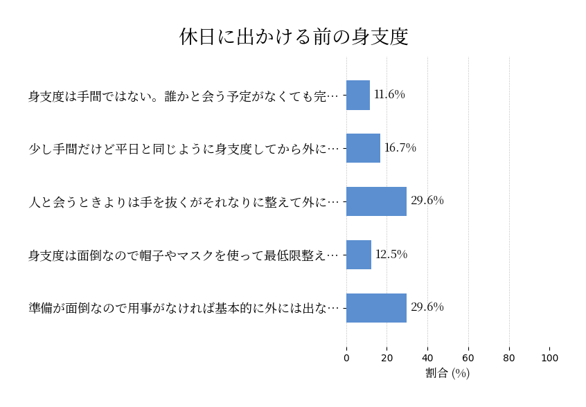 特に友達との予定はなく一人でランチしたり買い物でもしてぶらつこうかと思う休日の朝。しかし寝ぐせもひどくこのまま外に出るのはちょっとなというとき。シャワーを浴びたり化粧やコンタクトレンズを入れたり、どれくらい面倒と感じる?
