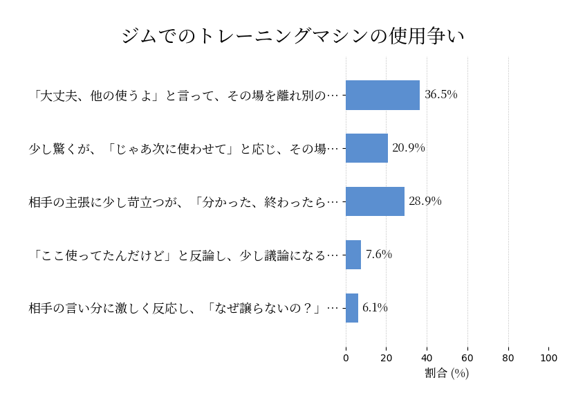 ジムでトレーニングしているとき、あなたが使おうとしたマシンが他の利用者に先に使用されてしまった。その人は「先に使っていた」と主張し、あなたにマシンを譲ろうとしない。この状況で、あなたはどう感じ、どう対応する?