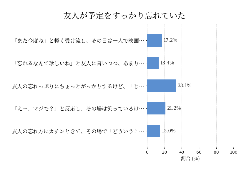 友人が予定をすっかり忘れていた先週から約束していた友人との映画鑑賞の日。しかし、待ち合わせ時間になっても友人は現れず、連絡してみると「すっかり忘れてた!」という返事が。この時、あなたはどう感じる?