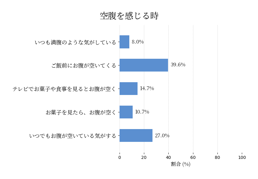 お腹が空いたと感じて、お菓子などの間食を食べたくなるのはどんな時か
