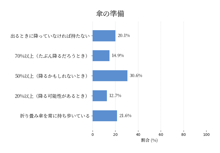 遊びにでかけるとき降水確率がどれくらいなら傘を準備しますか?