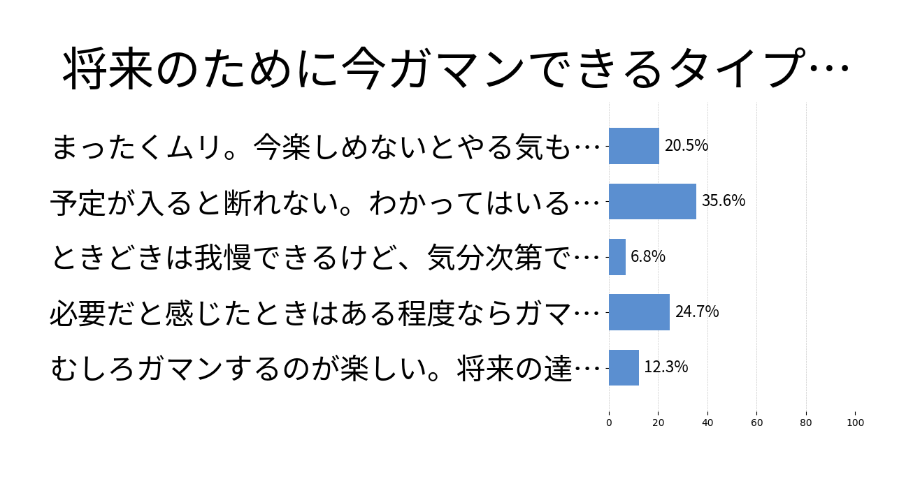 「今を優先する」って人が多いの見て、ちょっとホッとしたよね。将来のために今を我慢しろって、そんなに正しいことなんかなって思うときある。だってさ、自分の気持ちに反して、やりたいことを抑えてまで頑張るって、それ社会の設計がどっかおかしいだけじゃないの?って疑っちゃうんよ。みんなが今を楽しめない構造で未来をつくるって、なんか切ない。