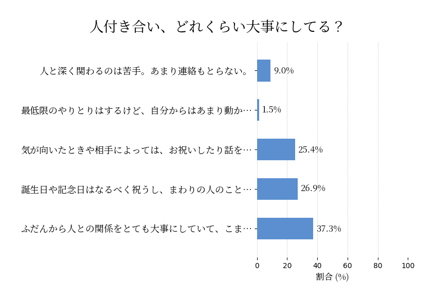 俺も人付き合いを大事にしてるつもりではあるけど、正直、誰にでもってわけじゃなくて、相手によるところが大きい。で、その「相手」がかなり絞られてる。要するに友達少ないだけかもしれないなって、ふと思うときがある。