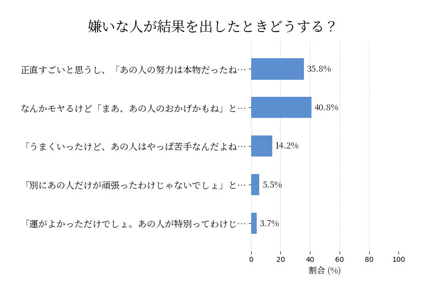 嫌いな人が評価されてたらまあ、いい気分はしないよね。だってそもそも「なんか違うな」って思ってるから嫌いなわけで、その人が褒められてると、自分の感覚が間違ってたみたいで地味にムカつく。相対的に自分が負けた気にもなるしね。