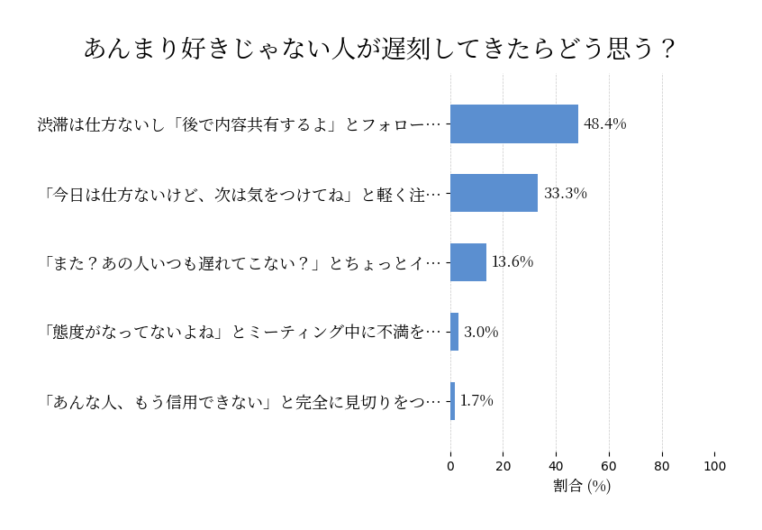何、あんまり好きじゃないやつが遅刻?それ、チャンスじゃん。大事な場面で遅刻してくるとか、またとない好機。内心ちょっと笑っちゃってるけど、もちろんそんなの顔にも出さない。絶対に。