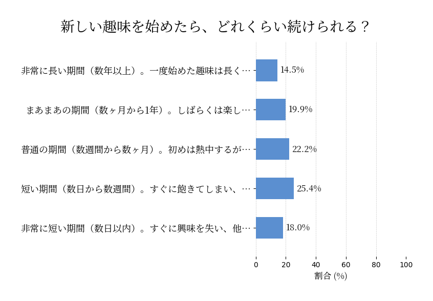あなたは日常生活で、新しい活動や冒険にどの程度積極的に取り組みますか?例えば、急に旅行に行くことを決めたり、新しい趣味を始めたり、未知の場所に一人で出かけたりす...
