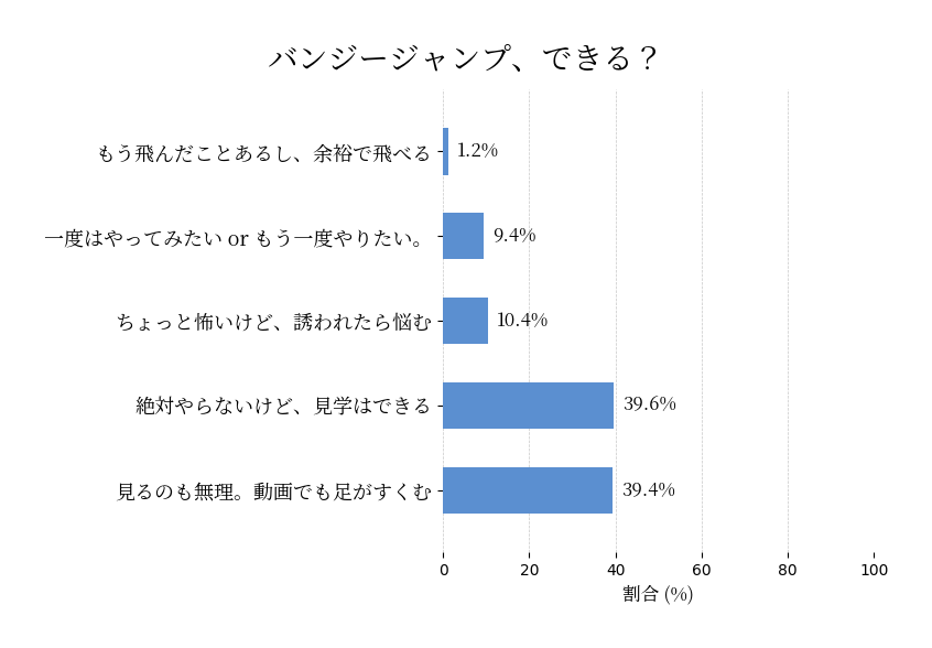 ちなみに俺も一回だけやったことあるんだけど、飛ぶ前も怖かったし、飛んでからもずっと怖かった。紐にぶら下がってる間とか、「なんでこんなことしてるんだろう」って気持ちでいっぱいだった。結論としては、これを考えたやつの動機がわからん。