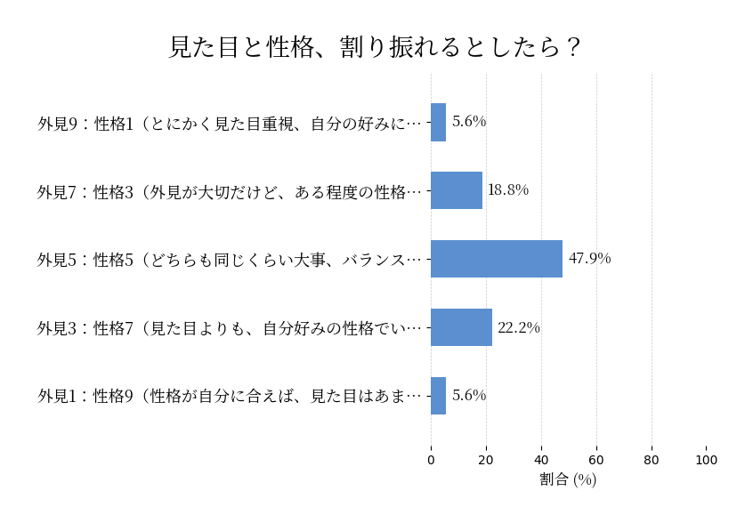 顔やスタイルにドキッとするのも大事。でも、付き合っていくうえで、性格や考え方、気の合う感じってどれくらい重視してる?見た目と中身、どっちにどれくらい重きを置いて...