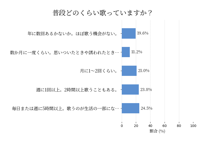 週に何時間も歌ってる人、けっこういるらしくて正直びっくりした。毎日そんなに歌ってて喉乾かないの?あと、歌う人って家に防音室でもあるの?それとも風呂場がライブ会場?俺の部屋、壁薄すぎて、ちょっと鼻歌でも出そうもんなら「ドンッ!」てされるから。壁の厚さに人生左右されてる説ある。