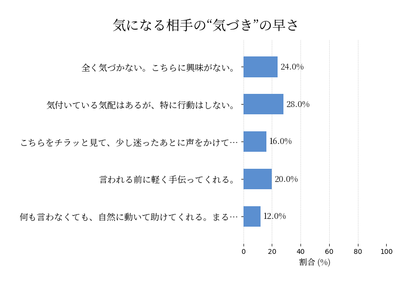 困ってる時の反応って、マジで相手の気持ちが透けて見えるよね。気づくの早い人は、やっぱりこっちのこと見てくれてるってことだし、それだけで結構嬉しいもん。逆に全然気づかない人は、まあ正直期待薄かなとは思う。